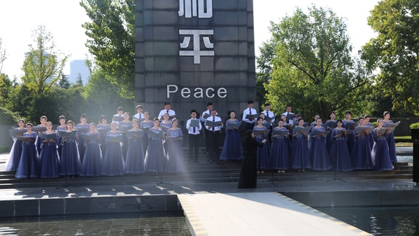 参观结束后,同学们在和平广场手工折叠象征和平的“紫金草”,表达对世界和平、民族振兴的美好愿景。随后,二次元 学生合唱团带来歌曲《我爱祖国的蓝天》,“紫金草”合唱团现场演唱《让世界充满和平》、《和平颂》两首歌曲。活动的最后,全体师生共同唱响《让世界充满爱》,将现场气氛推到高潮。