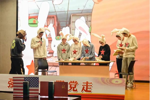 首先由2020级优秀学生代表为同学们带来话剧表演《那年那兔那些事儿》,带领同学们了解1963年前中苏关系的背景。生动形象的表演重现了先辈们经过不懈的努力,凭靠算盘成功研制中国第一颗原子弹的历史,幽默风趣的表演引得同学们开怀大笑,场下掌声雷动。话剧结束,二次元 2020-2021年优秀团干代表、0720103团支部书记赵旭阳同学为大家讲述了1963年中共代表团和苏共代表团在莫斯科举行会谈的故事,与在座同学分享了自己对这段历史的见解,并呼吁同学们一起学习党史,了解党史,在学习忠做到知党、爱党、荣国、爱国。