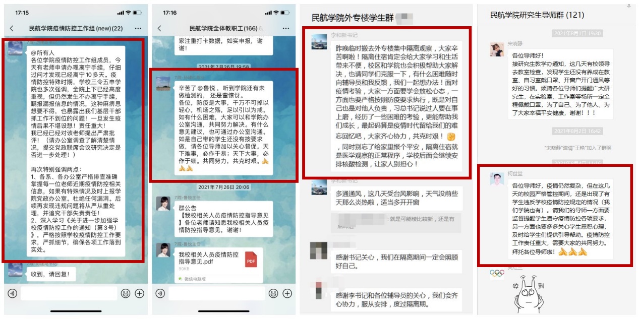 学院及时召开疫情防控工作视频会议,第一时间贯彻落实学校疫情防控工作精神和相关要求。各系办迅速召开疫情防控工作会议进行传达部署,空中交通系提出充分发挥党组织战斗堡垒和党员先锋模范作用,关注在校学生,加强交流。交通运输系强调以学生为本,细致核实本系留校和在外实习学生名录,导师主动对接学生、了解学生情况与需求。民航工程系从提高政治站位、压实疫情防控责任,加强系聘和团队人员管理等方面提出了相应要求。土木与机场工程系会提出全体教师率先做好疫情防控的“实践员”“宣传员”“战斗员”“保障员”,从思想上、行动上筑牢抗疫底线,践行伟大抗疫精神。