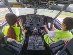 在飞机通压通电演示环节中,航空公司教员给同学们进行了发动机火警、飞机失速抖杆和货舱烟雾等险情测试,真实的飞机驾驶舱工作环境在带给学生视觉震撼的同时,也坚定了其航空报国情怀。