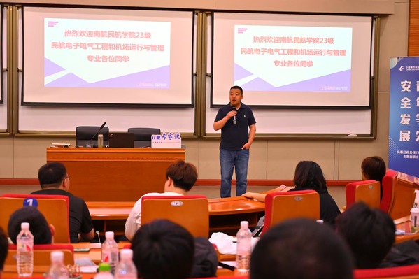 东航江苏公司培训中心负责人文洪围绕民用航空器故障诊断与维修开展“行业专家说”主题分享,并带领同学们走进培训车间。同学们在工作人员的指导下现场近距离观察飞机零部件的检测过程及进行操作演示。